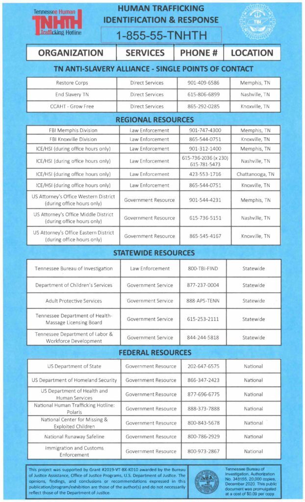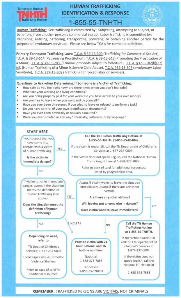 Suspect someone may be a victim of human trafficking? Call the Tennessee Human Trafficking Hotline at 1-855-55-TNHTH.